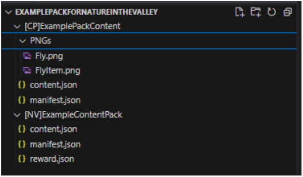 In the optional files for this mod you will find two example files for what a content pack for NITV looks like. In this example the content pack adds in two textures for a creature (A Fly), one being its sprite texture and the other its for its item texture. The images were put into the PNGS subfolder, and loaded in the \[CP]ExamplePackContent/content.json here;